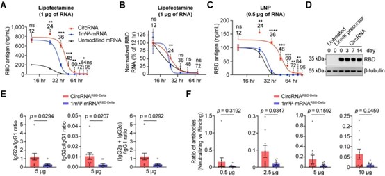一系列的對(duì)比評(píng)估表明,與mRNA疫苗相比,circRNA疫苗具有以下特點(diǎn)或優(yōu)勢(shì)(圖3):1)circRNA具有更高的穩(wěn)定性,可以在體內(nèi)產(chǎn)生更高水平、更加持久的抗原;2)circRNA疫苗誘導(dǎo)機(jī)體產(chǎn)生的中和抗體比例更高,可以更有效地對(duì)抗病毒變異,降低疫苗潛在的抗體依賴增強(qiáng)癥(ADE)副作用;3)circRNA疫苗誘導(dǎo)產(chǎn)生的IgG2/IgG1的比例更高,表明其主要誘導(dǎo)產(chǎn)生Th1型保護(hù)性T細(xì)胞免疫反應(yīng),可以有效降低潛在的疫苗相關(guān)性呼吸道疾?。?/span>VAERD,Vaccine-associated enhanced respiratory diseases)副作用。