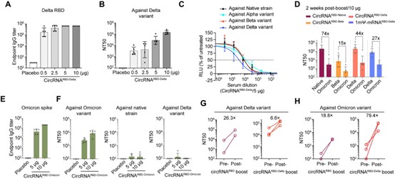 此外,在新冠病毒奧密克戎突變株被世界衛(wèi)生組織列為值得關(guān)注的變異株(Variants of Concern,VOC)后,研究團(tuán)隊(duì)緊急啟動(dòng)了針對(duì)該突變株的環(huán)狀RNA疫苗研發(fā)。在獲得病毒序列信息的30天內(nèi),完成了從疫苗生產(chǎn)、小鼠免疫到有效性評(píng)估的全流程。研究發(fā)現(xiàn),基于奧密克戎變異株的環(huán)狀RNA疫苗(circRNARBD-Omicron)的保護(hù)范圍狹窄,其誘導(dǎo)產(chǎn)生的抗體只能夠中和奧密克戎變異株。而針對(duì)德爾塔變異株設(shè)計(jì)的環(huán)狀RNA疫苗(circRNARBD-Delta)則可以在小鼠體內(nèi)誘導(dǎo)產(chǎn)生廣譜的中和抗體,有效中和包括奧密克戎株在內(nèi)的多種新冠變異株(圖4)。