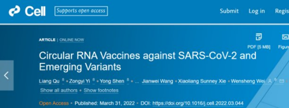 1.Wensheng Wei et al. Circular RNA Vaccines against SARS-CoV-2 and Emerging Variants. Cell(2022)https://doi.org/10.1016/j.cell.2022.03.044