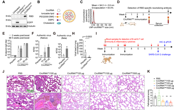 研究發(fā)現(xiàn),“該環(huán)狀 RNA 疫苗可以在小鼠和恒河猴體內(nèi)誘導(dǎo)產(chǎn)生高水平的新冠病毒中和抗體以及特異性 T 細(xì)胞免疫反應(yīng),并可以有效降低新冠病毒感染的恒河猴肺部的病毒載量,顯著緩解新冠病毒感染引起的肺炎癥狀。”